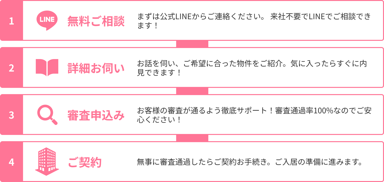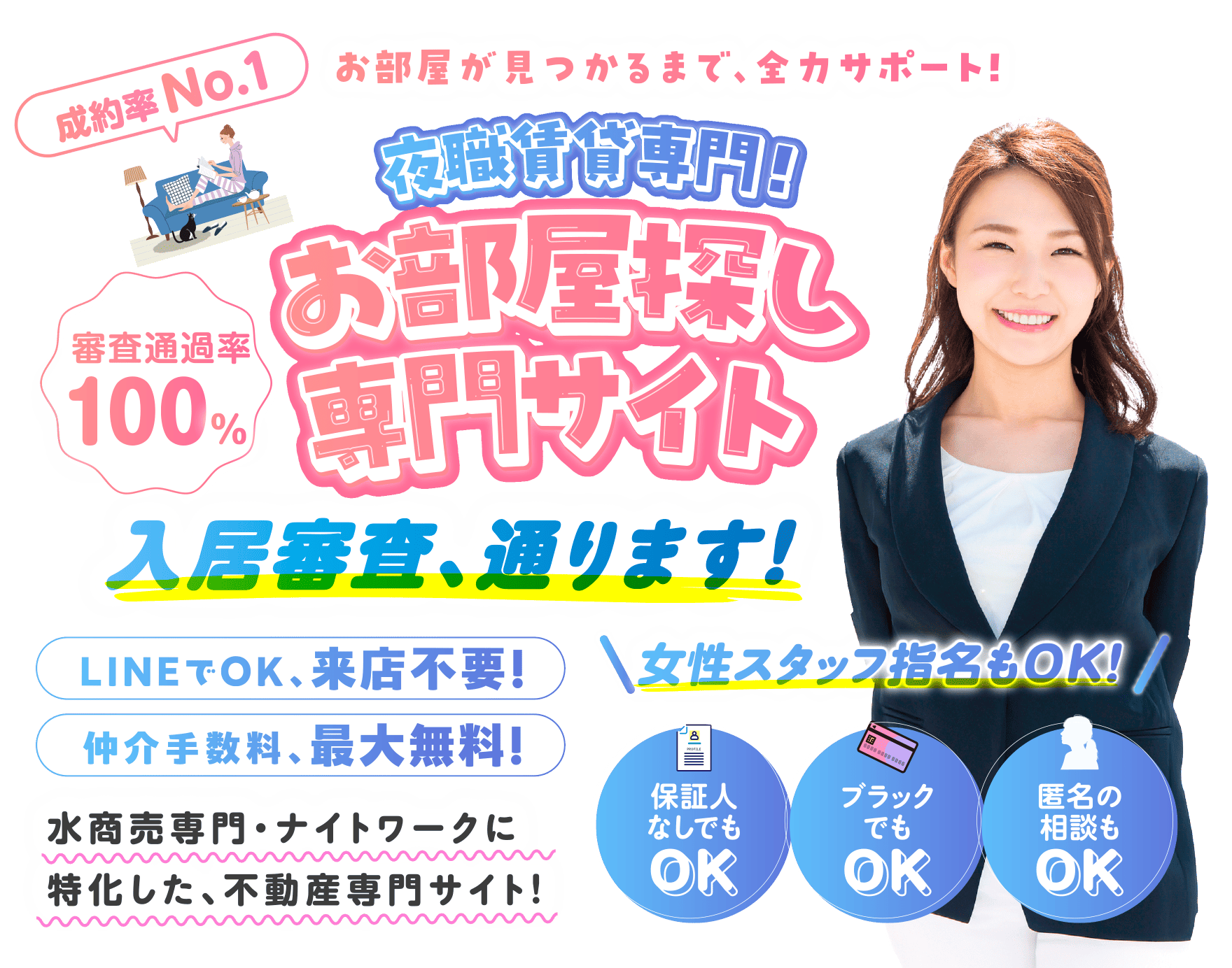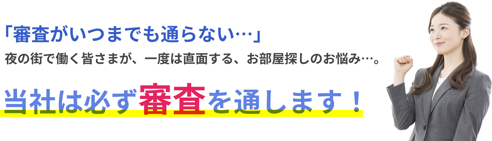 - ご安心ください。お客様のご事情や状況に合わせて、審査に支障のない物件をご紹介いたします。さらに、ご希望条件にできる限り近い物件を提案させていただきます。